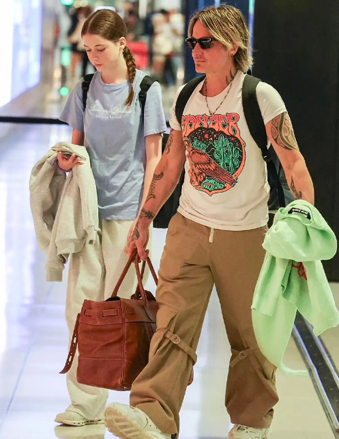 В честь такого события Кит Урбан решил поддержать жену своим присутствием. Так, его и 13-летнюю Фейт заметили в аэропорту Сиднея. Дочь музыканта и актрисы была одета в стиле кэжуал, а сам Урбан выбрал футболку с принтом и легкие брюки. В руке у артиста была объемная сумка и рюкзак со всем необходимым для длительного перелета через океан.