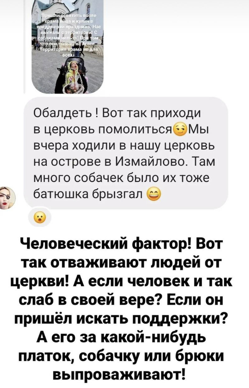 «Пришли освятить возле храма яйца и кулич в преддверии праздника. Нас выгнали с территории! С собаками нельзя! При том, что они только на Агате. Территория храма не для всех!» — рассказала женщина на странице своего блога.