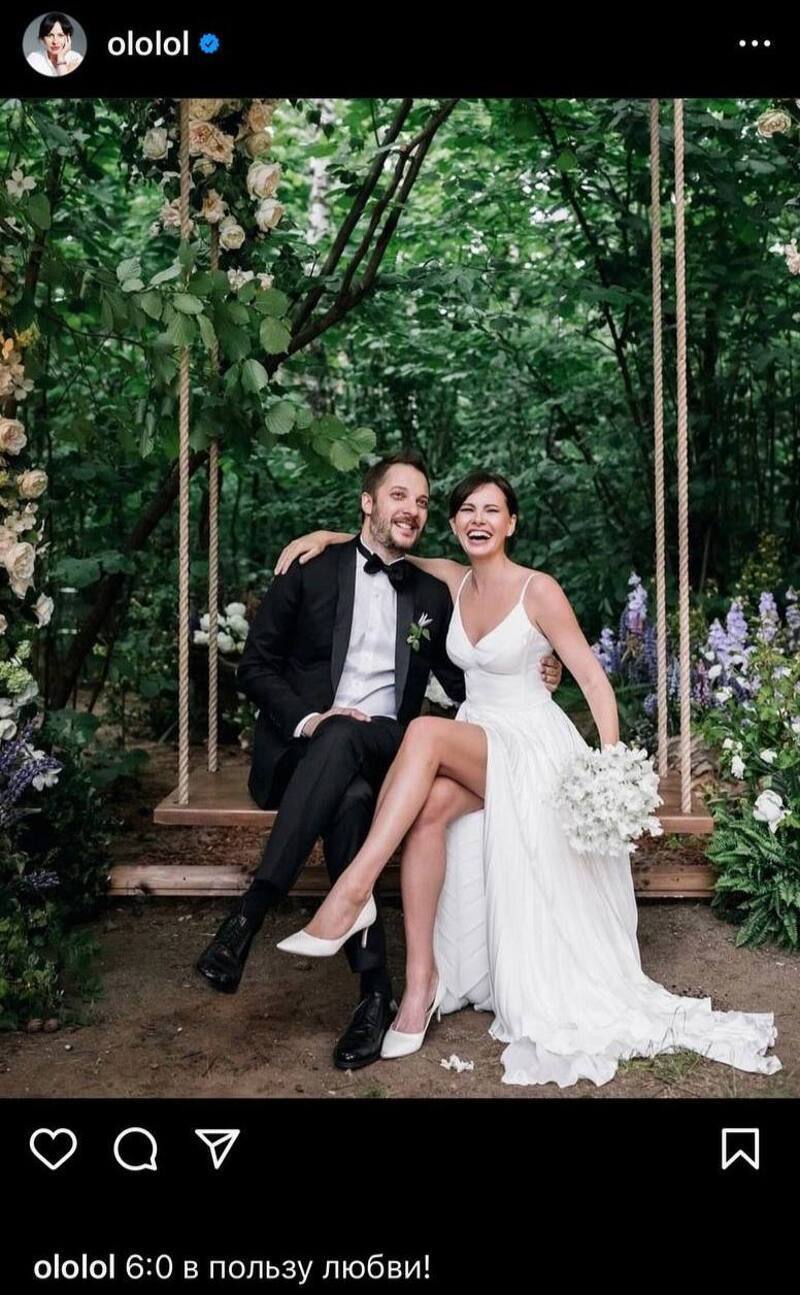 Так, 45-летняя артистка поделилась в соцсети свадебной фотографией с писателем, которую подписала: «6:0 в пользу любви!». В кадре супруги выглядят счастливыми, сидя на качелях в свадебных образах.