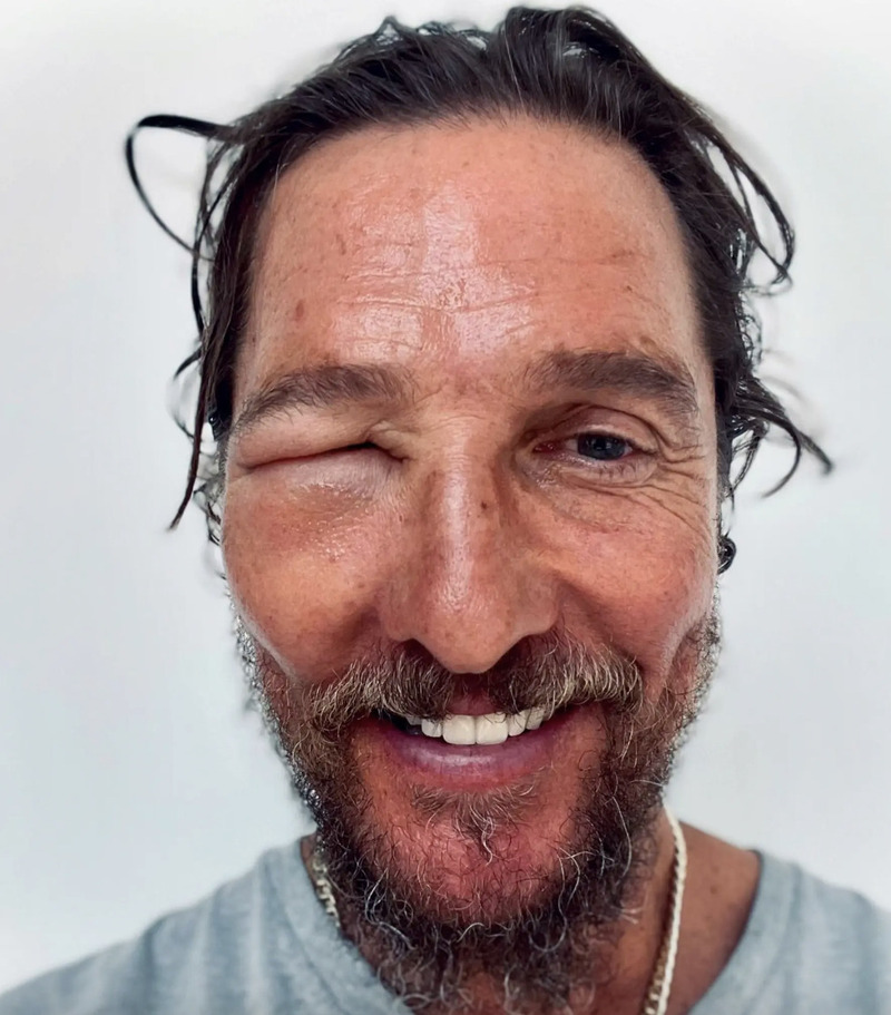 Недавно Мэттью Макконахи получил укус пчелы в глаз, из-за чего глаз распух и закрылся. В среду он опубликовал в запрещенной соцсети ужасающую фотографию последствий атаки насекомого.