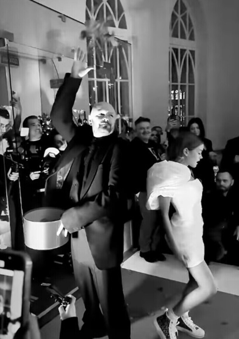 Александрина облачилась в белое мини-платье и туфли на каблуках, которые позднее она сменила на свободные кеды. Горобец надел черный готический костюм. Новоиспеченные супруги выглядели счастливыми и веселились от души.