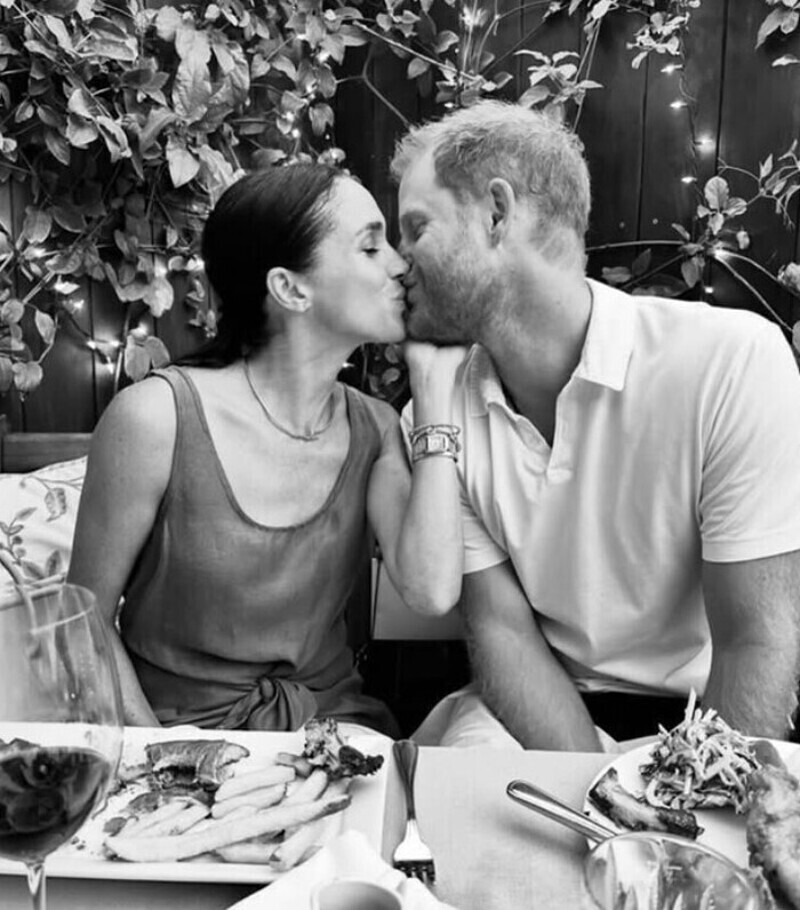 На черно-белом снимке Меган и Гарри запечатлены во время милого поцелуя. Кадр подписан так: «Герцогиня Сассекская Меган поделилась этим милым фото в честь Дня святого Валентина. Она напоминает, что находится дома с их малышами и уже скучает по мужу, который сейчас на Invictus Games. Она гордится им и его деятельностью».