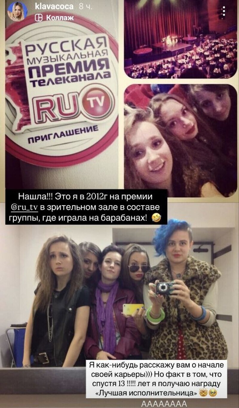 Впечатленная собственным успехом на премии RU TV, где ей присудили звание лучшей исполнительницы года, Кока вспомнила, с чего начинала свой путь в шоу-бизнес. «Это я в 2012 на премии RU TV в зрительном зале в составе группы, где играла на барабанах. Я как-нибудь расскажу вам о начале своей карьеры. Но факт в том, что спустя 13 лет я получаю награду "Лучшая исполнительница», — делится эмоциями Клава.