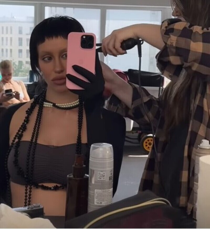 Герлфренд рэпера опубликовала кадры, сделанные в парикмахерской. Ей покрасили волосы в черный цвет и сделали экстремально короткую челку. Валентина позировала в кресле, представ в коротком топе, черных перчатках и бусах.