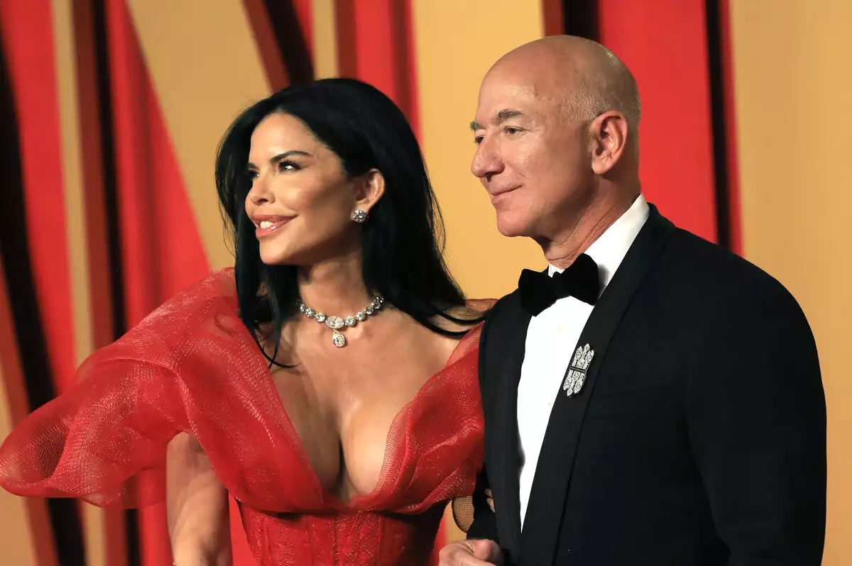 55-летняя журналистка облачилась в длинное прозрачное платье с леопардовым принтом на бретелях. Черное нижнее белье Санчес просвечивало сквозь легкую ткань. Ведущая дополнила образ массивным золотым браслетом и миниатюрной сумочкой, которую держала в руке. Сияющий Безос, одетый в серую футболку и брюки, держал жену за руку. Джефф, судя по его виду, в полном восторге от брака и самой Лорен.