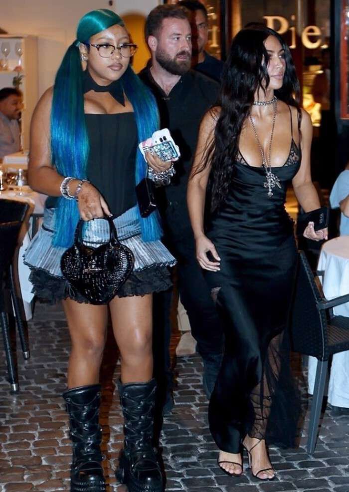 Накануне Ким и Норт были замечены рядом с одним из ресторанов Рима. Мать и дочь попали в объективы папарацци, когда выходили из заведения. Уэст-младшая выглядела эпатажно в корсетном топе, мини-юбке и брутальных сапогах на шокирующей платформе, благодаря которой Норт «переросла» мать. «Изюминки» образу придали синие волосы, которые девочка собрала в два хвостика.