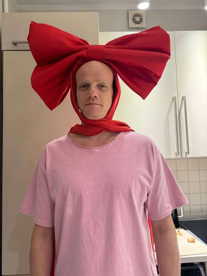 Звезда «Игры престолов» позировал в непринужденной домашней обстановке. Его голову украсил огромный красный бант, благодаря которому Юрий напоминал, скорее, новогодний арт‑объект. Забавным контрастом к этому аксессуару послужила простая розовая футболка свободного кроя. «Кому такую елку ставим в этом году?» — игриво спросил Юрий.