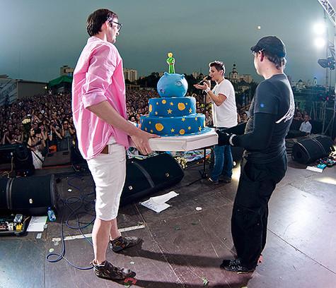 И конечно, какой же день рождения без торта! На сцену вынесли огромный трехъярусный торт в виде мальчика на шаре. Метровое сооружение разрезали за кулисами на кусочки и по тарелочкам передавали в зрительный зал. Арбенина переживала, чтобы торт достался всем. И в перерывах между песнями то и дело спрашивала: «Нож нашли? Порезали? Раздали?»