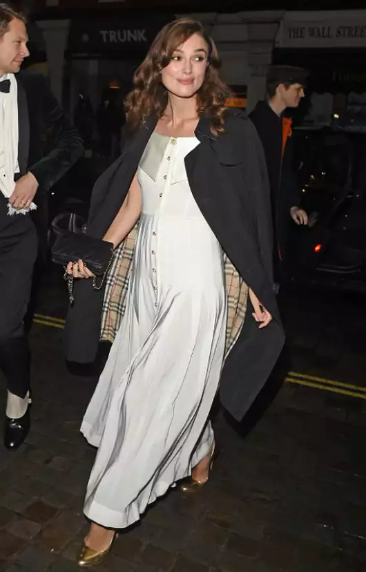 Найтли пришла на вечер в свободном белом платье на пуговицах. Наряд, видимо, был призван скрыть изменившуюся фигуру актрисы, однако на деле все получилось иначе — мягкие складки наряда лишь подчеркнули заметно округлившийся животик Киры.