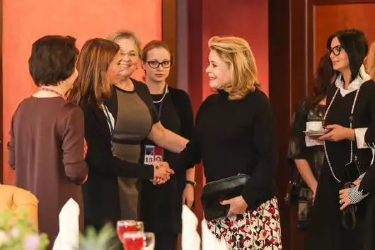 Первый день пребывания французской дивы в Ханты-Мансийске начался с так называемого «Дамского завтрака» в компании губернатора Натальи Комаровой, а также звезд российской эстрады Екатерины Стриженовой, Алены Бабенко, Елены Дробышевой, Алисы Хазановой, Ирины Апексимовой и др. Дамским его назвали потому, что на встрече присутствовали только женщины. Идея такого формата встречи была взята у Каннского фестиваля, где подобные мероприятия уже давно практикуются. Каждая гостья в течение пяти минут должна была рассказать о себе. Не исключением стала и Катрин Денев, сказавшая несколько слов. Правда, как призналась артистка позднее, для нее подобный формат общения стал неожиданным: «Было весьма необычно оказаться за столом с двадцатью женщинами, которых не знаешь и впервые видишь», — пошутила французская звезда.