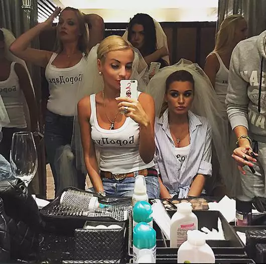 Вчера Ксения Бородина с десятью близкими подругами, среди которых были замечены Алена Водонаева, Дарья Пынзарь и Катя Жужа, развлекались в районе Нового Арбата. Сначала девушки расслабились и отдохнули в spa-салоне, а потом отправились в караоке-клуб неподалеку. Ксения попросила подруг одеться в джинсы и майки с надписями, сделанными специально к вечеринке.