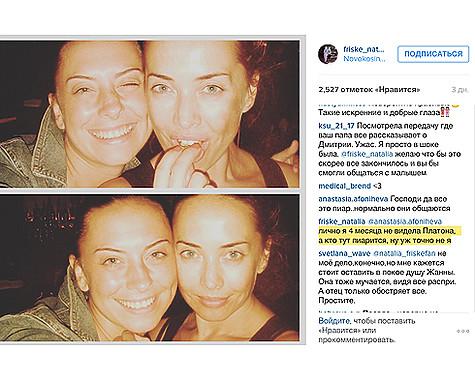 В конце прошлой недели появилась информация о том, что маме Жанны Фриске Ольге Владимировне разрешили увидеться с внуком Платом, которому 7 октября исполнилось 2,5 года. В прессе даже появились папарацционные снимки, на который видно, что счастливая бабушка держит на руках любимого внука. У поклонников Фриске, казалось бы, появилась надежда, что между родителями и гражданским супругом Жанны может наступить перемирие. Но не тут-то было. Сестра певицы, Наталья в разговоре с подписчиками разоткровенничалась и высказала мнение, что встреча бабушки и внука была специально организована Дмитрием для папарацци. Одна из читательниц — karina198426 — спросила: «Наташа, скажите, Платона наконец-то дали вашим родителям или война продолжается?» (здесь и далее орфография и пунктуация авторов сохранены, — прим. WomanHit.ru). На что Фриске ответила: «продолжается. вчера специально журналистов позвал к дому… Мама говорила что её просили сфотографироваться… Она все сразу поняла, и тут же появляются фото в интернете)) ну уже смешно если честно».