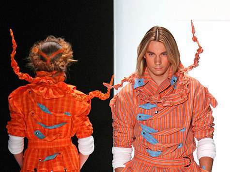 Вслед за именитым родителем любитель модных провокаций Егор Зайцев тоже решил взять курс на массового потребителя. Он оставил ветки-щупальца лишь в качестве аксессуаров и вывел на подиум рубаху-девку из чеховского «Вишневого сада».