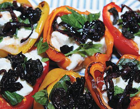 Вам потребуется: 4 сладких перца, 3 красные луковицы, 50 г сахарной пудры, 50 мл бальзамического уксуса (или уксуса красного вина), 50 мл оливкового масла, 8 помидоров, 3—4 анчоуса, 10 оливок без косточек, 4 зубчика чеснока, небольшой пучок базилика, 1 большая моцарелла — буффало, специи.