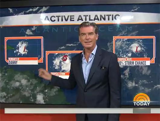 Пирс Броснан стал ведущим прогноза погоды в прошлый вторник на канале NBC в передаче «Сегодня». Поначалу актер, известный по роли Джеймса Бонда, выглядел в кадре очень уверенно. Но увидев на интерактивной карте изображения циклонов над Атлантикой, неожиданно заявил, что на Америку движется мощное цунами. «Ого, какие большие круги. Цунами! Кажется, скоро нас всех накроет», — сказал в прямом эфире Пирс. Но после сам испугался своего прогноза и попросил помощи у настоящего ведущего Эла Рокера. Вбежавший в кадр Рокер поспешил всех успокоить, что Броснан несколько преувеличил масштабы бедствия. Он сообщил, что сформировавшийся над океаном шторм не несет за собой никакой разрушительной силы и пройдет стороной. После профессионального прогноза Эла Пирс и, надо полагать, все телезрители вздохнули с облегчением. А актер, воспользовавшись новым знакомством с Рокером еще и поинтересовался, какая погода ждет его на Гавайях, куда он в скором времени отправится в отпуск.