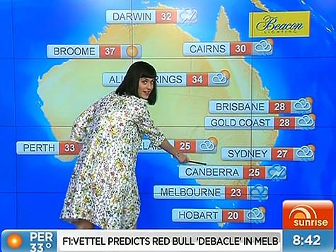 Кэти Перри пригласили выступить в качестве ведущей прогноза погоды популярного австралийского утреннего шоу «Восход» в марте прошлого года. Широко улыбающаяся певица сначала рассказала телезрителям, что накануне была на вечеринки у подруги по случаю рождения ребенка, а после бодро сообщила: «Жителей Кэрнса ждут небольшие осадки». При этом поп-везда рукой показывала совсем на другой город — Перт, расположенной на противоположной стороне континента. Затем Канберру Кэти обозвала Кунаберрой, а город Хобарт — Хогвартсом. При этом Перри постоянно смеялась, так что, не исключено, что она просто шутила.
