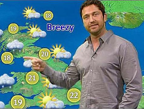Джерард Батлер блеснул в роли ведущего прогноза погоды в 2009 году на британском канале GMTV. В кадре актер вел себя очень эмоционально, радуясь за те города, которым метеорологи обещали ясное солнце, и расстраиваясь за регионы, где должны были пройти дожди. При этом Джерард совершенно произвольно водил пальцем по карте и без стеснения заглядывал в декольте настоящей ведущей прогноза Клэр Назир. А в конце своего экспрессивного выступления Батлер многозначительно заявил: «Температура на севере страны, я полагаю, будет чуть ниже, чем температура на юге».